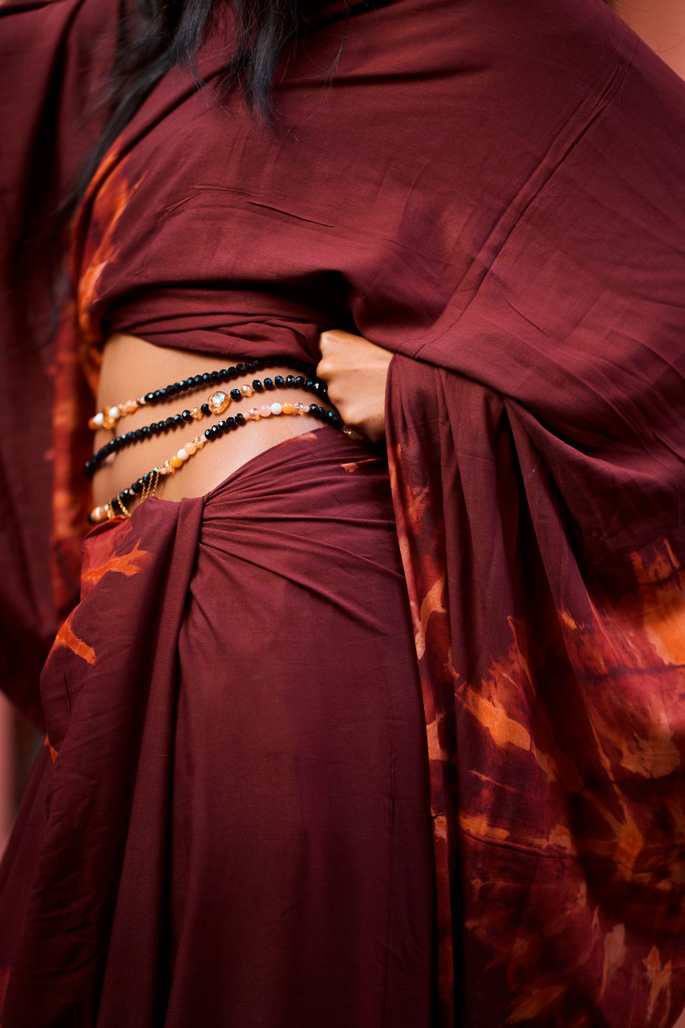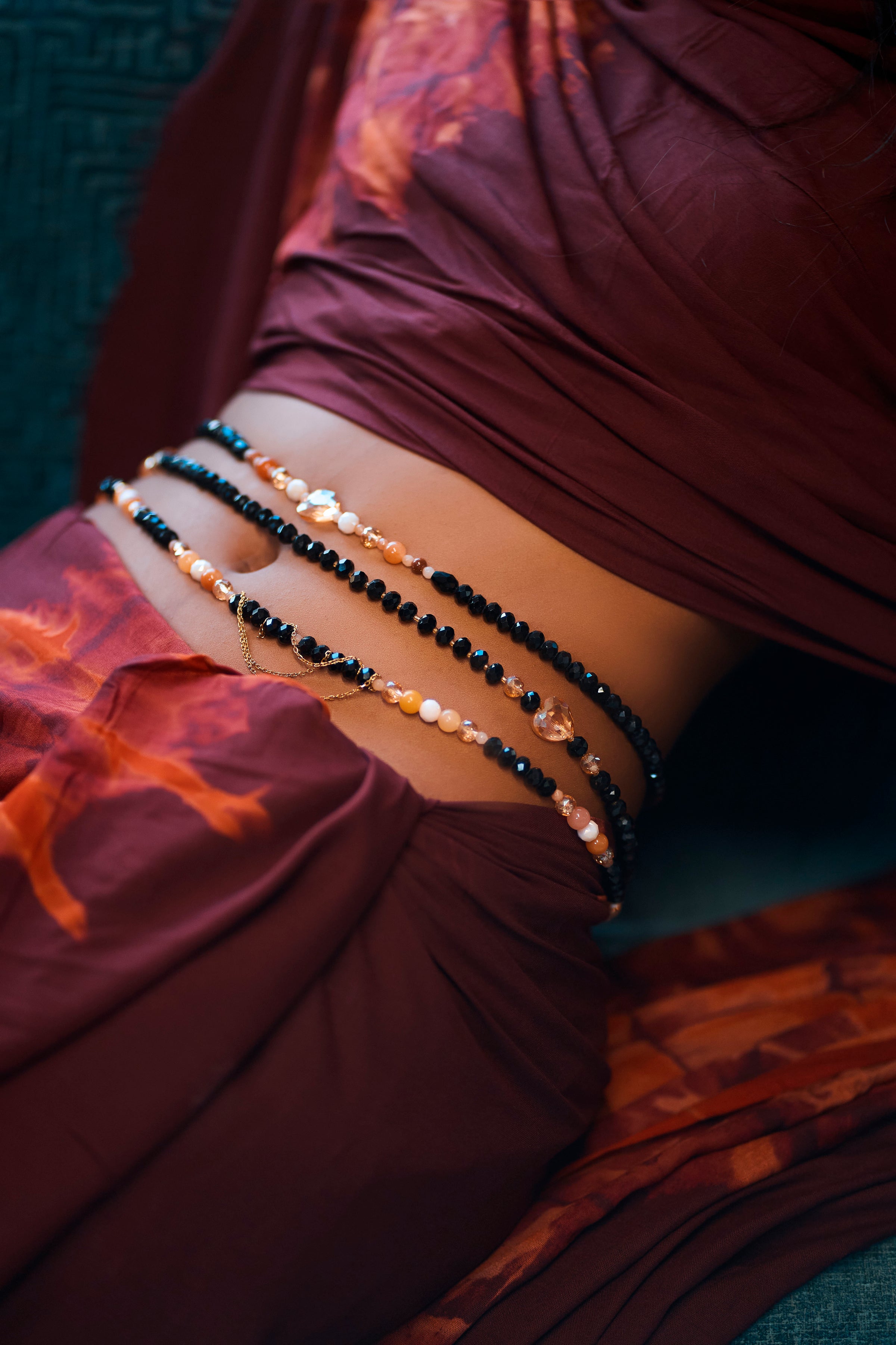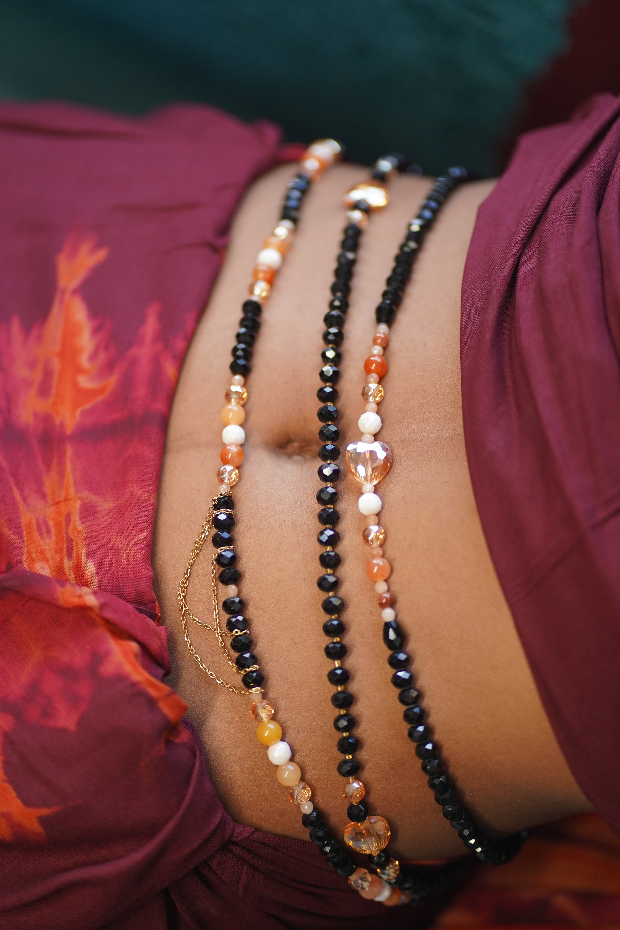 Ses perles aux teintes profondes et chaleureuses créent un équilibre subtil entre sobriété, sensualité et raffinement. Chaque élément est soigneusement sélectionné pour offrir un bijou de taille à la fois esthétique, confortable et durable.